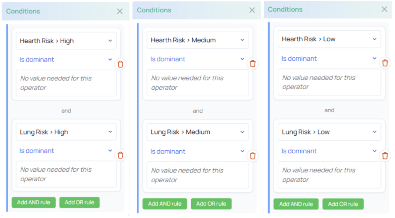 In this example, we evaluate two categories: Heart Risk and Lung Risk, and target three scenarios: