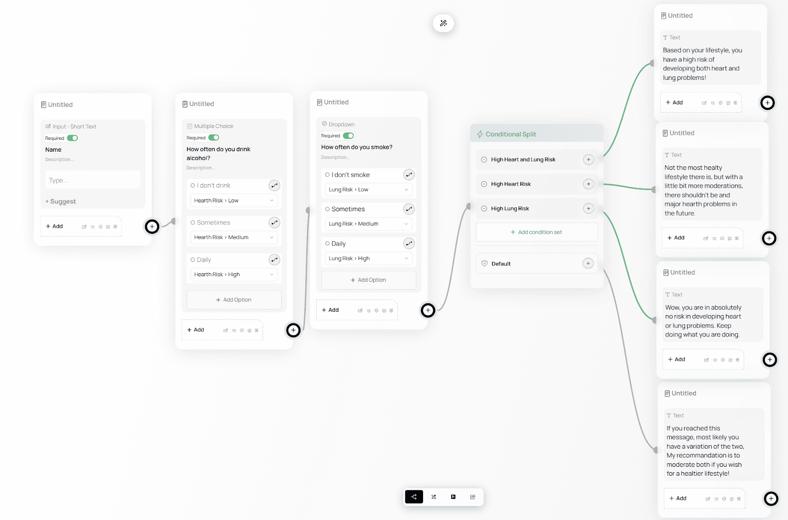 Each outcome leads to a tailored message using Text nodes.