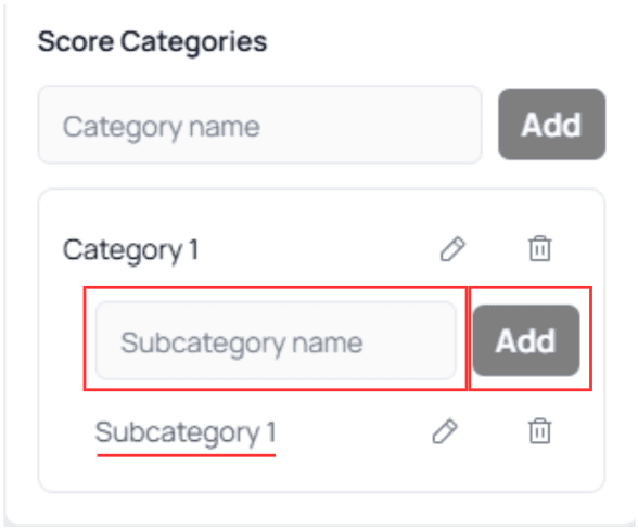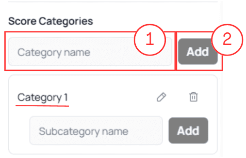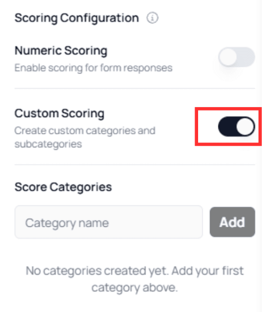 Toggling Custom Scoring will reveal the configuration interface, including the ability to create Categories and Subcategories.