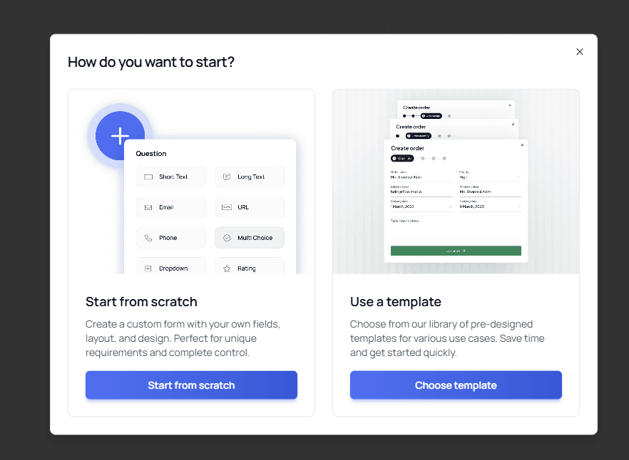 Tip: If you're new to Formflow, starting from scratch helps you understand how the Canvas works. Once you're familiar, templates can save time when building more complex forms.