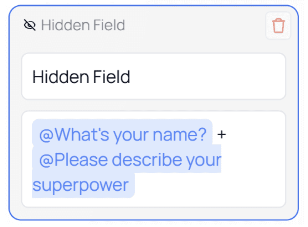 Hidden Fields work seamlessly with @Mentions, allowing you to combine answers from multiple questions, pages, or system values.Example Usage