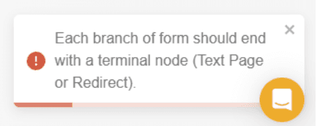 Every path in your form must end with a Terminal Node. Otherwise, the form cannot be published.The Text node displays a message to the user and can serve as a Terminal Node to end a form flow.