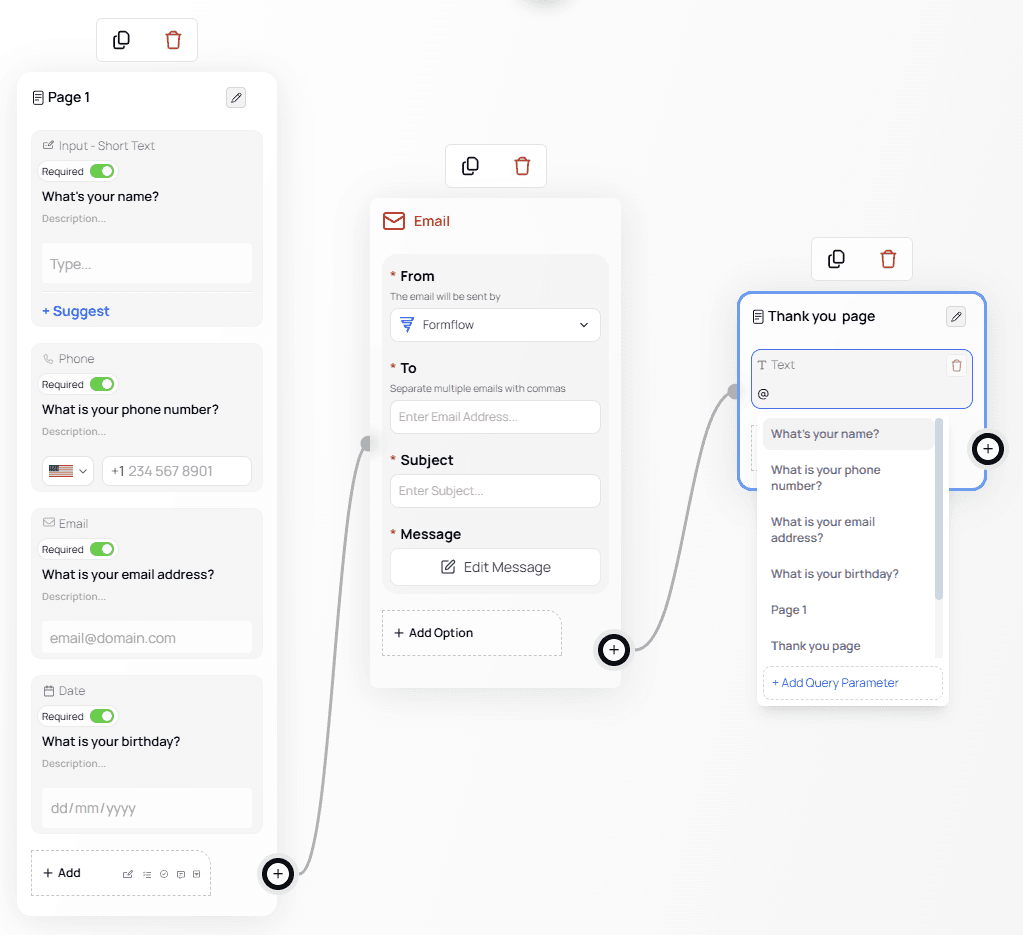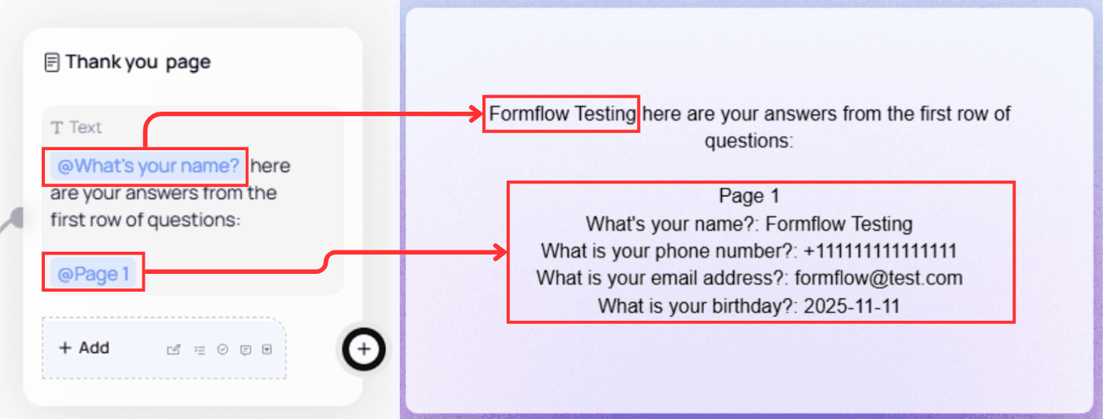 @Mentions let you reference values from your form anywhere inside the Canvas — including email notifications, conditional logic, and text nodes.