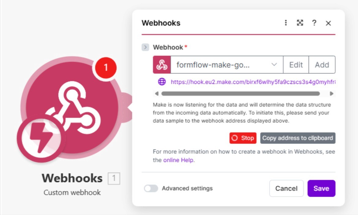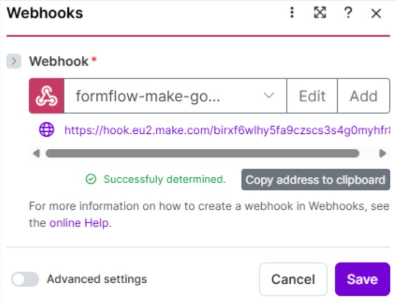 Very important step, copy the address either by clicking the button, or copying the link manually. This link will be used inside the webhook node in our Formflow form.
