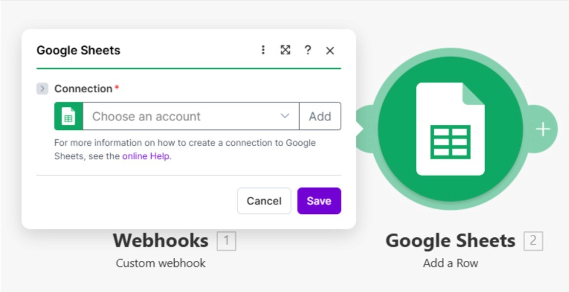 Now select the Google Sheets module inside the scenario builder and link your google account.
