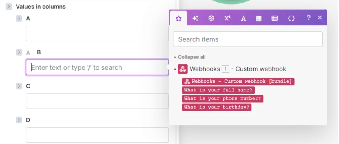 Selecting one of the inputs we are presented with the mapped values from our form: