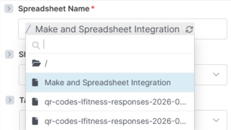 Click the Spreadsheet Name option and select the spreadsheet we’ve created previously.