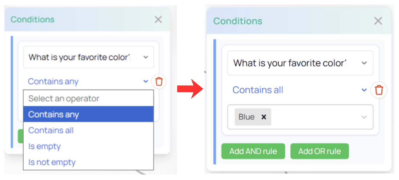 In this example, Contains all means:If the user selects any of the listed values, this condition is met.