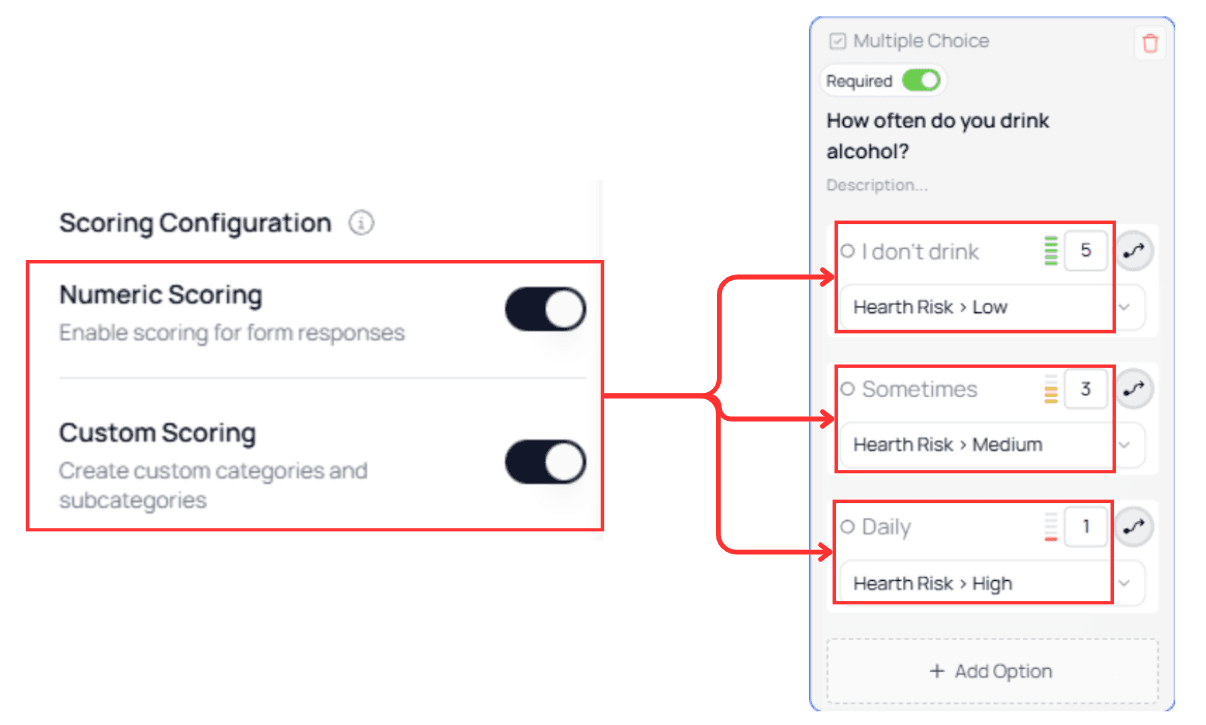 Once both scoring types are toggled on in the Scoring Configuration panel, options inside Dropdown and Multiple Choice nodes will display: